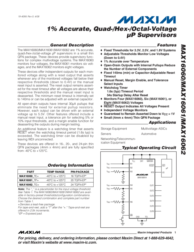 MAX16060 High Accuracy, Quad Voltage &microP Reset with Independent Power Good Outputs