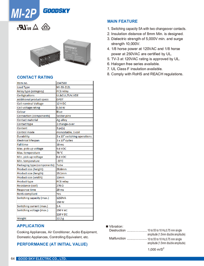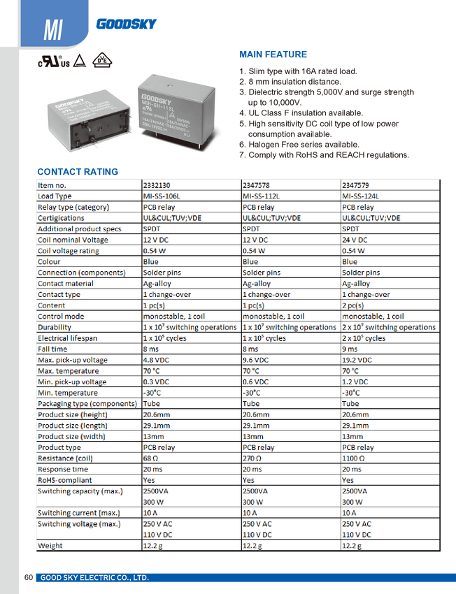 GoodSky MI-SS-212L Przekaźnik SMT MI-SS-212L, monostabilny, 1 cewka, 110 V/DC, 5 A, 1 szt.