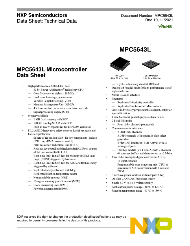 NXP 32-bit MCU, Power Arch core, 512KB Flash, 64MHz, -40/+105degC, Automotive Grade, QFP 144