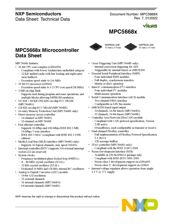 NXP 32-bit MCU, Power Arch, 2MB Flash, 116MHz, -40/+125degC, Automotive Grade, MAPBGA 208
