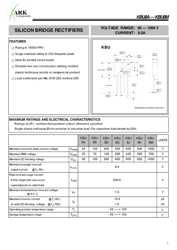 Mostek prostowniczy Graetza 8A, 1000V, KBU