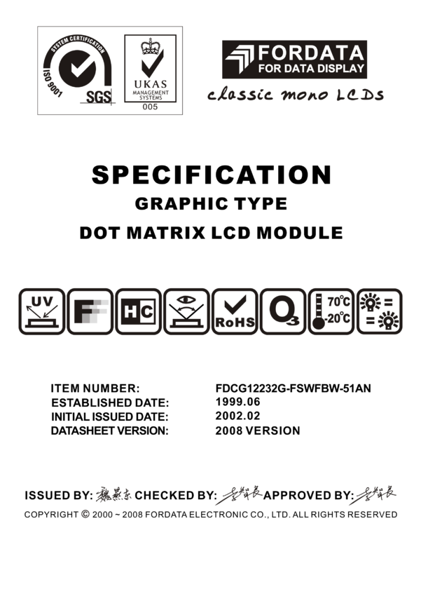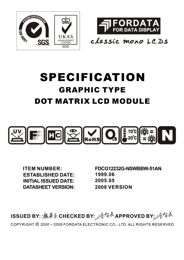 Matryca graficzna , negatywowa, podświetlenie , z filtrem UV, 06:00, -20/+70C, ekran , FORDATA [FDCG12232G-FSWFBW-51AN]