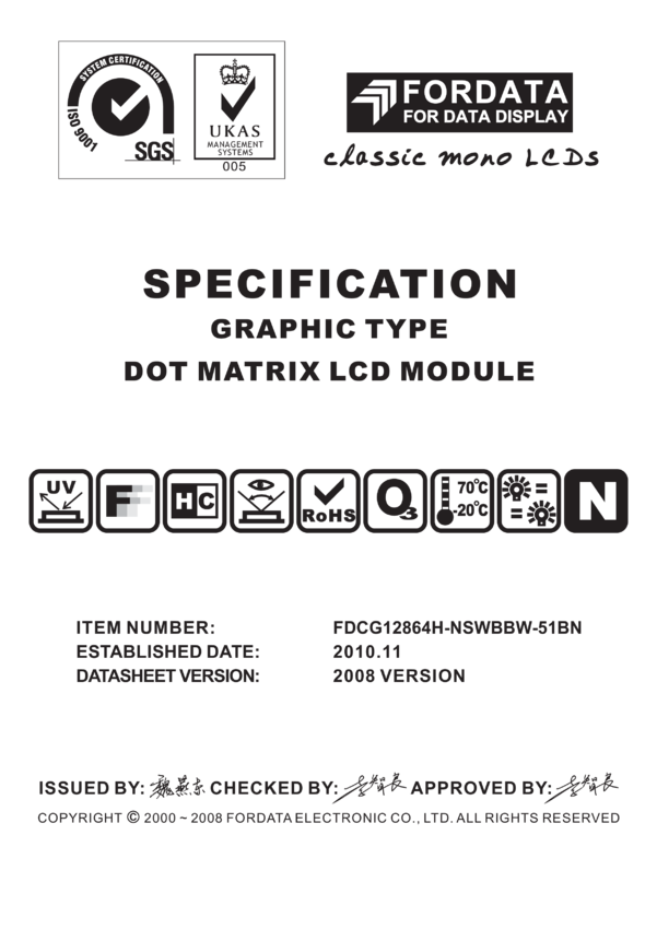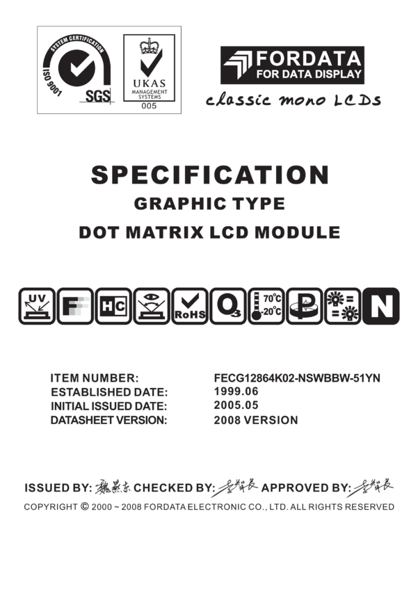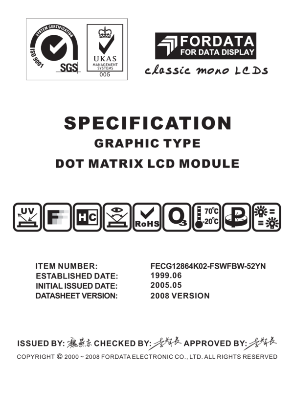 Matryca graficzna , pozytywowa, podświetlenie , z filtrem UV, 06:00, -20/+70C, ekran , FORDATA [FECG12864K02-NSWBBW-51TN]