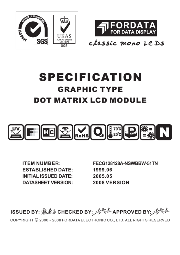 Matryca graficzna , negatywowa, podświetlenie , 06:00, -20/+70C, ekran , FORDATA [FECG128128A-FSWFBW-51TN]