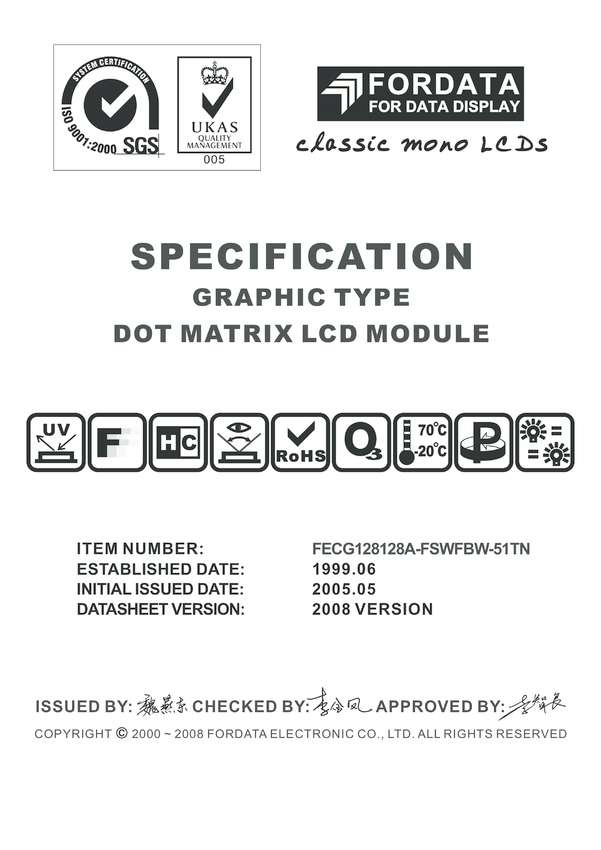 Matryca graficzna , pozytywowa, podświetlenie , 06:00, -20/+70C, ekran , FORDATA [FECG128128A-FSWFBW-51YN]
