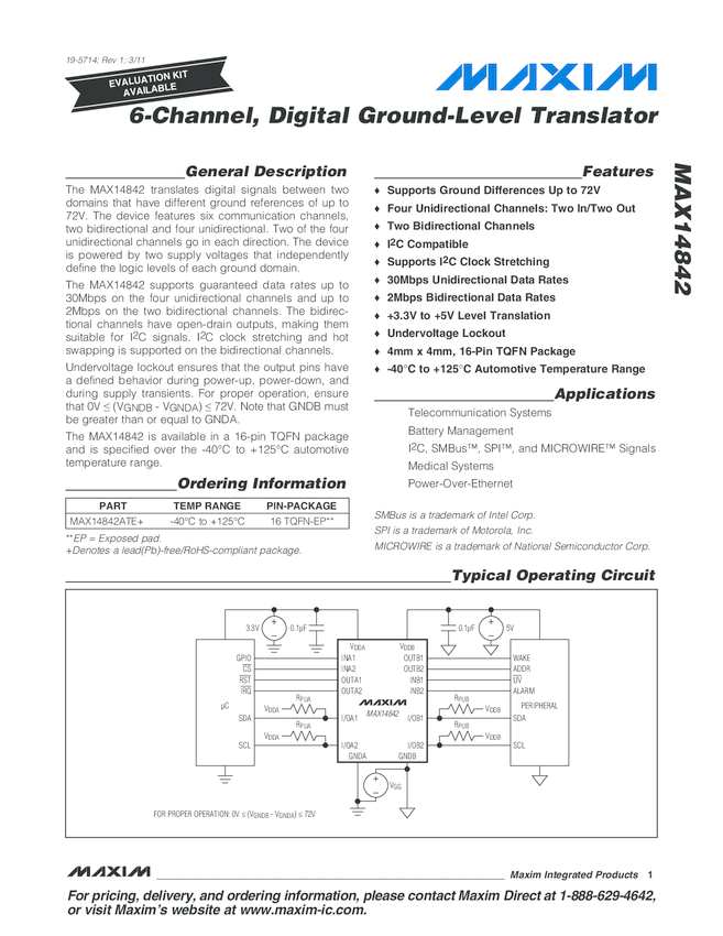MAX14842 Six-Channel, Digital Ground-Level Translator