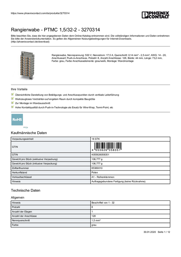 Terminal grzebieniowy Phoenix Contact 3270314 zacisk push-in 1 szt.