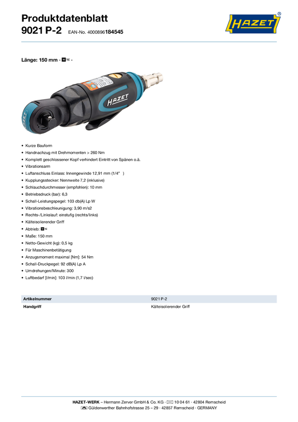 Grzechotka pneumatyczna Hazet 9021P-2 9021P-2 6.3 bar 3/8" (10 mm) zewnętrzny czworokąt