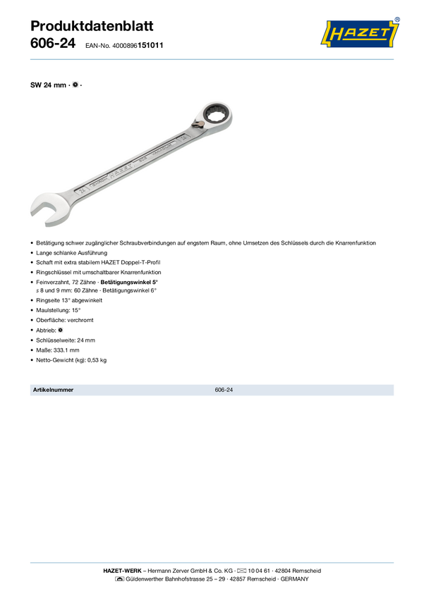 Hazet 606-24 606 Klucz płasko oczkowy z grzechotką Rozmiar klucza (metryczny) (tylko do tytułu) 24 mm