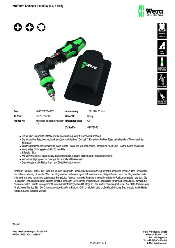 Wkrętak z grzechotką Wera Kompakt Pistol RA-R 1 05051535001 do warsztatu