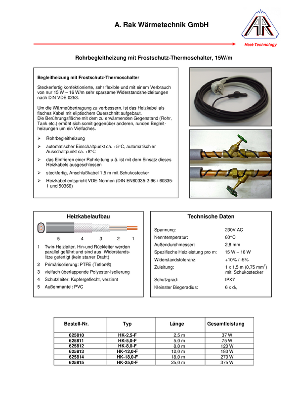 Kabel grzewczy Arnold Rak, 5 m, IPX7, 230V, 75W, z zabezpieczeniem przed mrozem