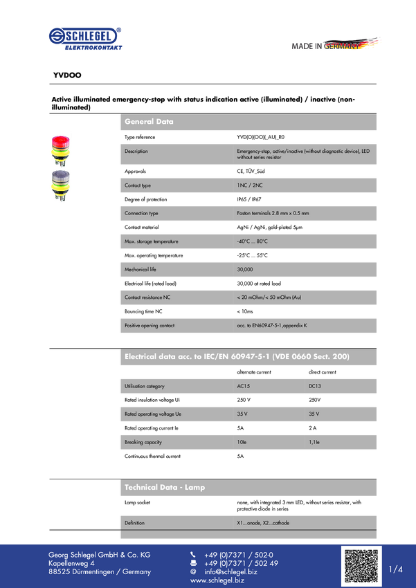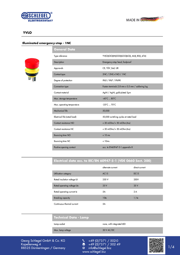 Wyłącznik awaryjny, grzybkowy Schlegel YVDOO_R0, 2 NC, 2 szt.