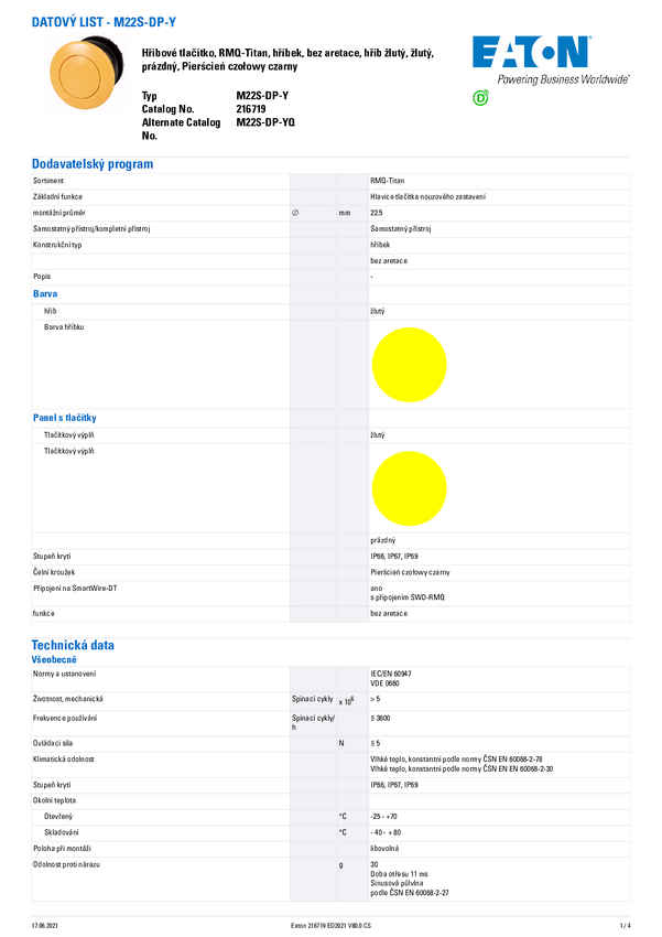 Eaton 216719 M22S-DP-Y Przycisk grzybkowy żółty 1 szt.