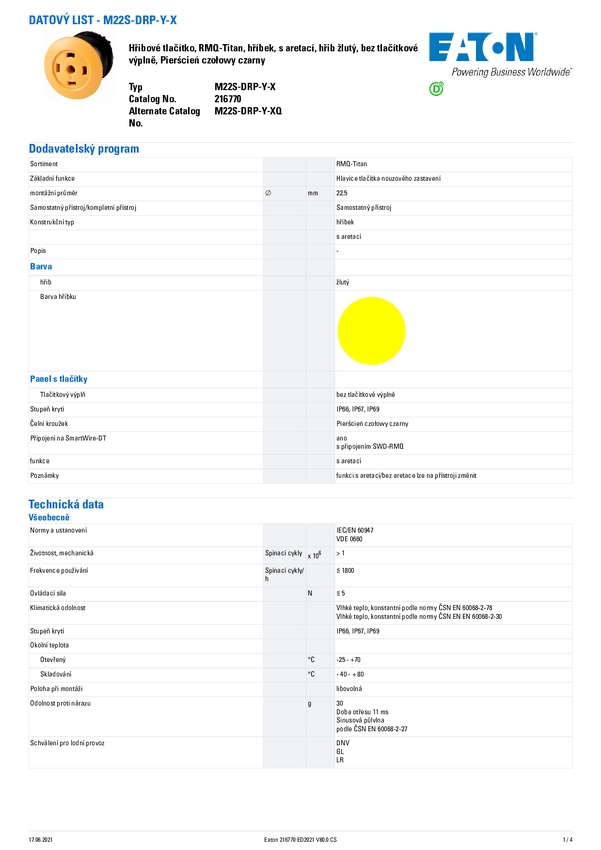 Eaton 216769 M22-DRP-Y-X-GVP Przycisk grzybkowy pierścień przedni z tworzywa sztucznego 1 szt.