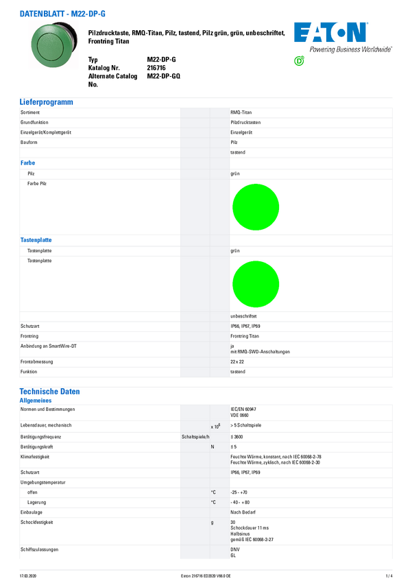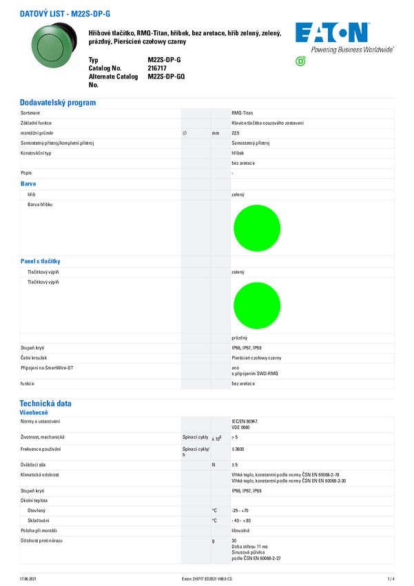 Eaton 216717 M22S-DP-G Przycisk grzybkowy zielony 1 szt.