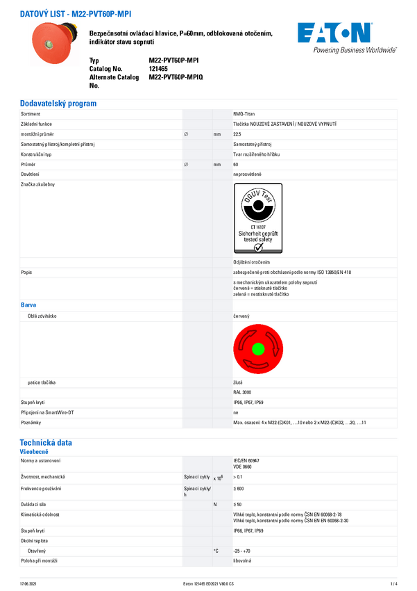 Eaton 121465 Przycisk grzybkowy zatrzymania awaryjnego M22-PVT60P-MPI, 1 szt.