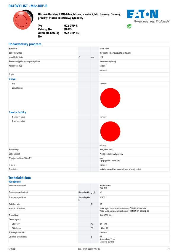 Eaton 216745 M22-DRP-R Przycisk grzybkowy czerwony 1 szt.