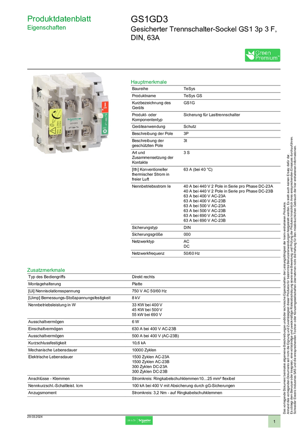 Schneider Electric GS1GD3 Podstawa, Przełącznik rozłączający 1 szt.