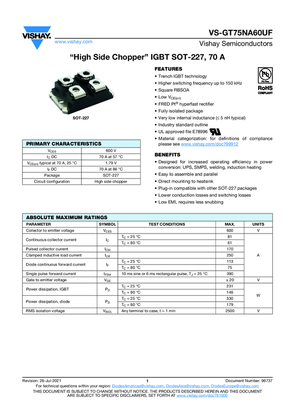 “Low Side Chopper” IGBT SOT-227, 70 A