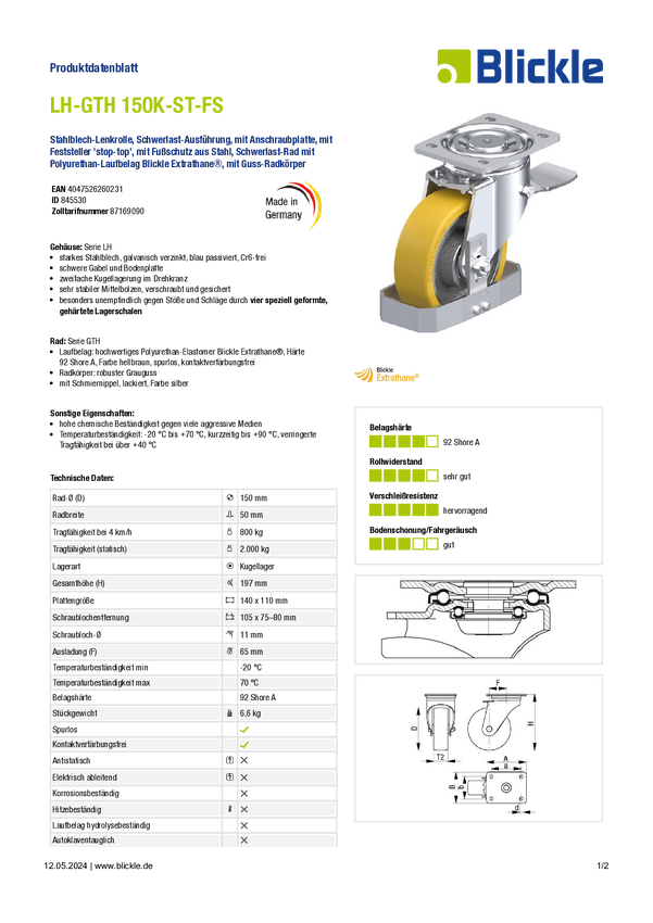 Blickle 845530 LH-GTH 150K-ST-FS Rolka obrotowa z blachy stalowej Średnica koła: 150 mm Maksymalne obciążenie: 800 kg 1