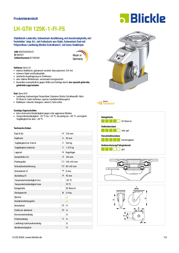 Blickle 882357 LH-GTH 125K-1-FI-FS Rolka obrotowa z blachy stalowej Średnica koła: 125 mm Maksymalne obciążenie: 550 kg