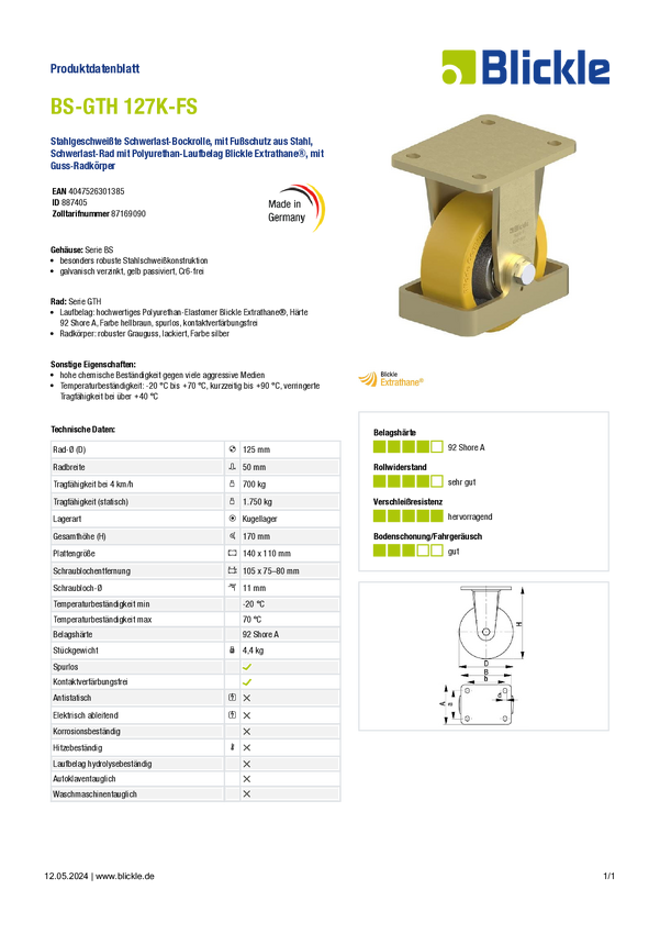 Blickle 887405 BS-GTH 127K-FS Koło stałe do dużych obciążeń Średnica koła: 125 mm Maksymalne obciążenie: 700 kg 1 szt.