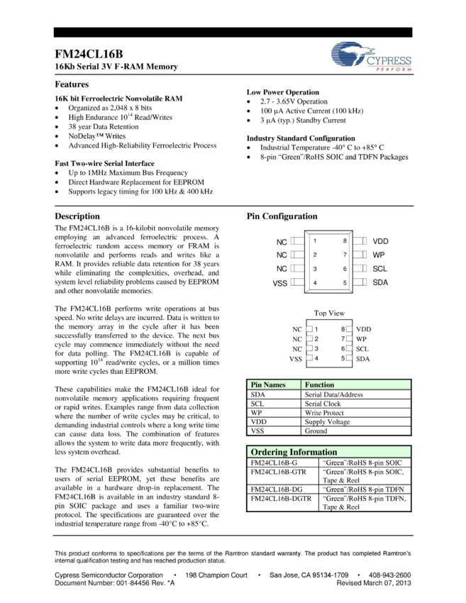 Pamięć szeregowa FRAM, FM24CL16B-GTR, 16Kb, interfejs I2C, SO8, Ramtron