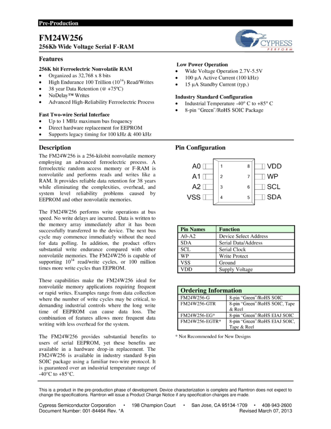 Pamięć szeregowa FRAM, FM24W256-GTR, 256Kb, interfejs I2C, SO8, Ramtron