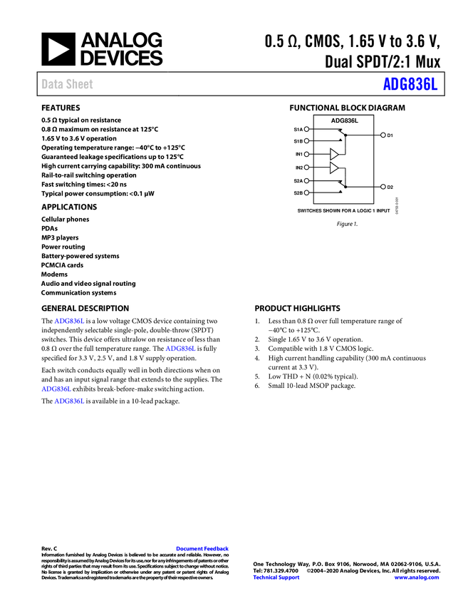 0.5 Ω CMOS 1.65 V to 3.6 V Dual SPDT/2:1 MUX w/Guaranteed Leakage Performance