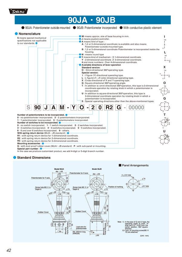 Joystick przemysłowy na bazie potencjometrów SFCPE22E i 22AC wersje z różnymi rękojeściami; YO -2 axes osłona gumowa, wersja z rękojeścią typ 105 z dodatkowym switchem Momentary push button SW Sprężyna powrotan do środka dla każdej osi