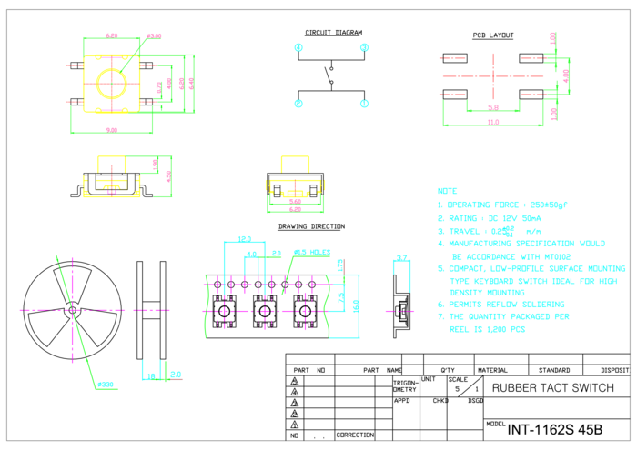 Łącznik z gumowym przyciskiem , o sile nacisku 250gf, do montażu SMD