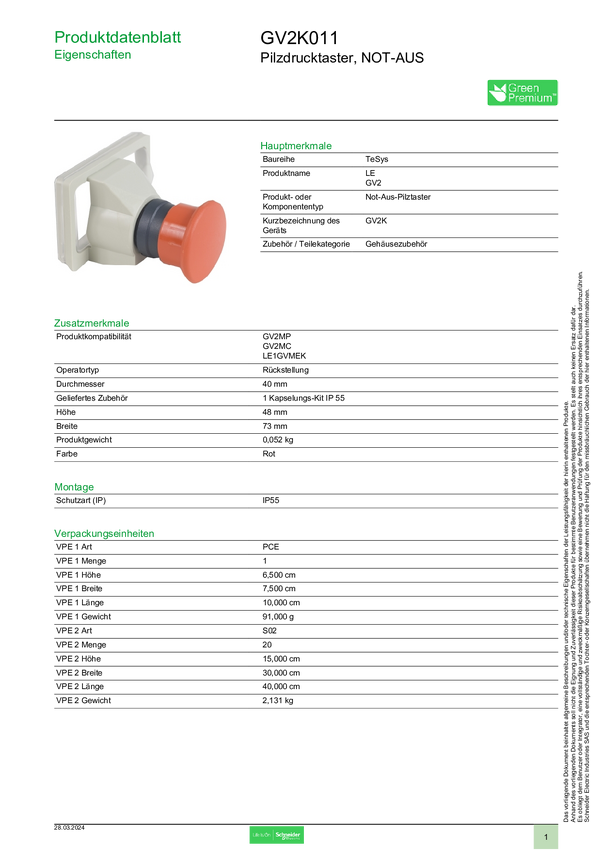Schneider Electric GV2K011 Przycisk grzybkowy 1 szt.