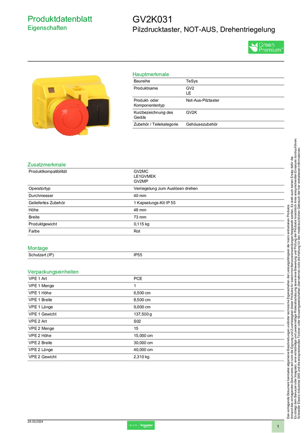 Schneider Electric GV2K031 Przycisk grzybkowy 1 szt.