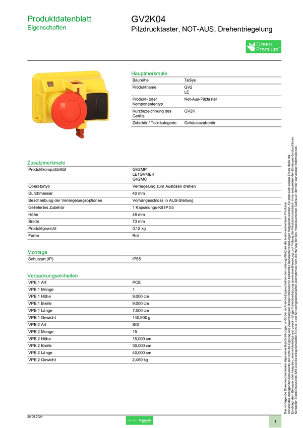 Schneider Electric GV2K04 Przycisk grzybkowy 1 szt.