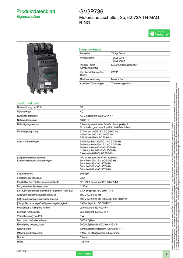 Przekaźnik ochronny silnika Schneider Electric GV3P73 (S x W x G) 55 x 132 x 136 mm 1 szt.