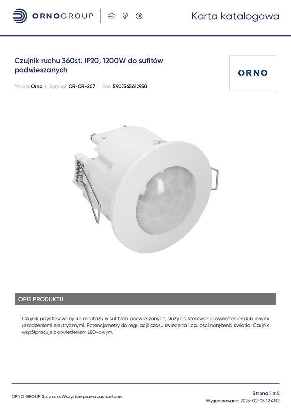 Czujnik ruchu; OR-CR-207; PIR; sufitowy; 230VAC; 1200W; 5A; IP20; 6m; Zakres: 10s-15min; 3...2000lx; biały; fi 76x75,6mm; 360*; gwarancja: 3 lata; ORNO
