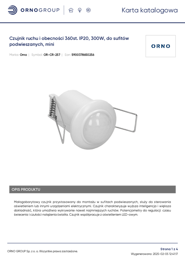Czujnik ruchu; OR-CR-257; PIR; sufitowy; 230VAC; 300W; 1,3A; IP20; 6m; Zakres: 10s-15min; 3...2000lx; biały; fi 43x66,5mm; 360*; gwarancja: 3 lata; ORNO