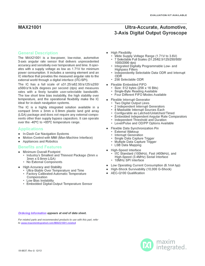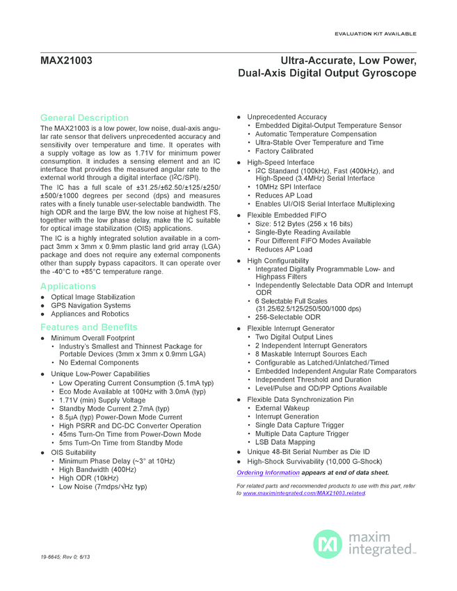 MAX21000 Ultra-Accurate, Low Power, 3-Axis Digital Output Gyroscope