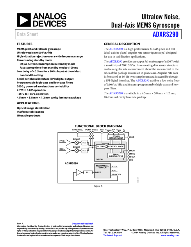 ADXRS290: Ultralow Noise, Dual-Axis Gyroscope