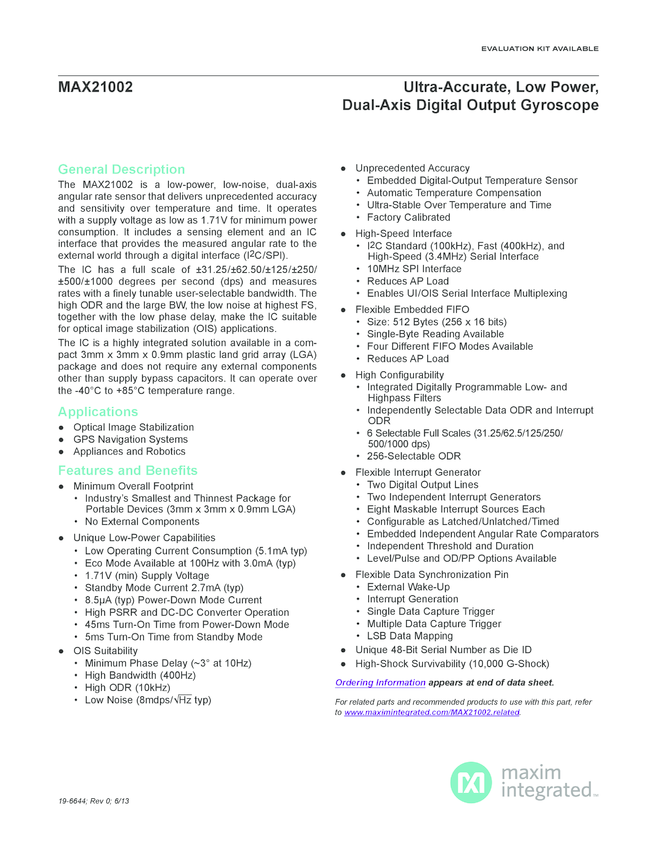 MAX21002 Ultra-Accurate, Low Power, Dual-Axis Digital Output Gyroscope