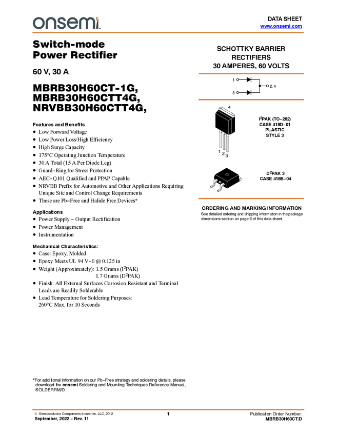 Schottky Barrier Rectifier, H-Series, 60 V, 30 A