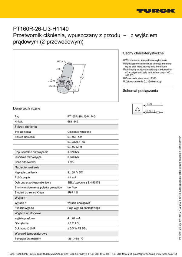 Turck Przetworniki ciśnienia 1 szt. PT160R-26-LI3-H1140