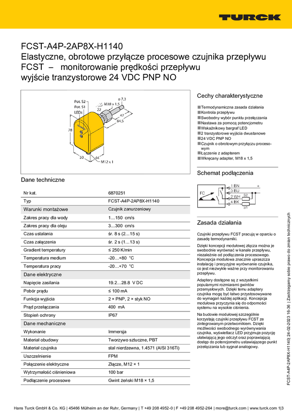 Turck 6870251 Czujnik zanurzeniowy FCST-A4P-2AP8X-H1140, 19.2 - 28.8 V/DC, 1 szt.