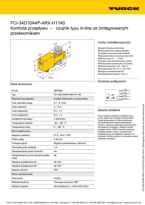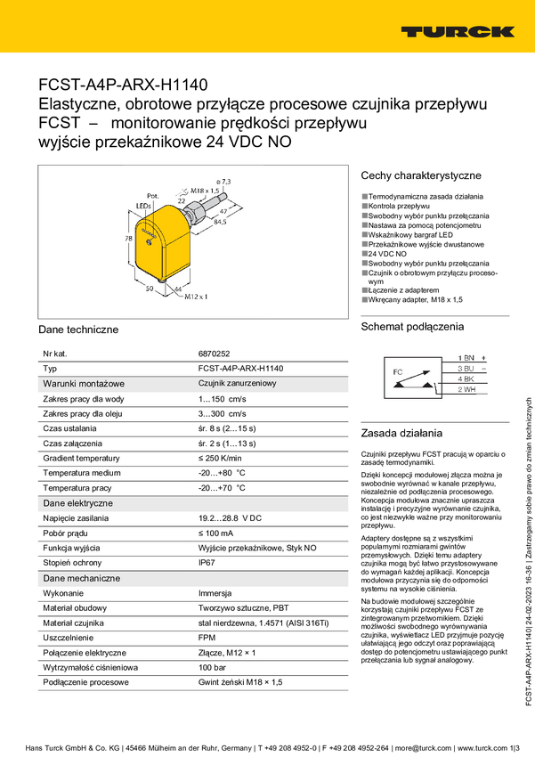 Turck 6870252 Czujnik zanurzeniowy FCST-A4P-ARX-H1140, 19.2 - 28.8 V/DC, 1 szt.