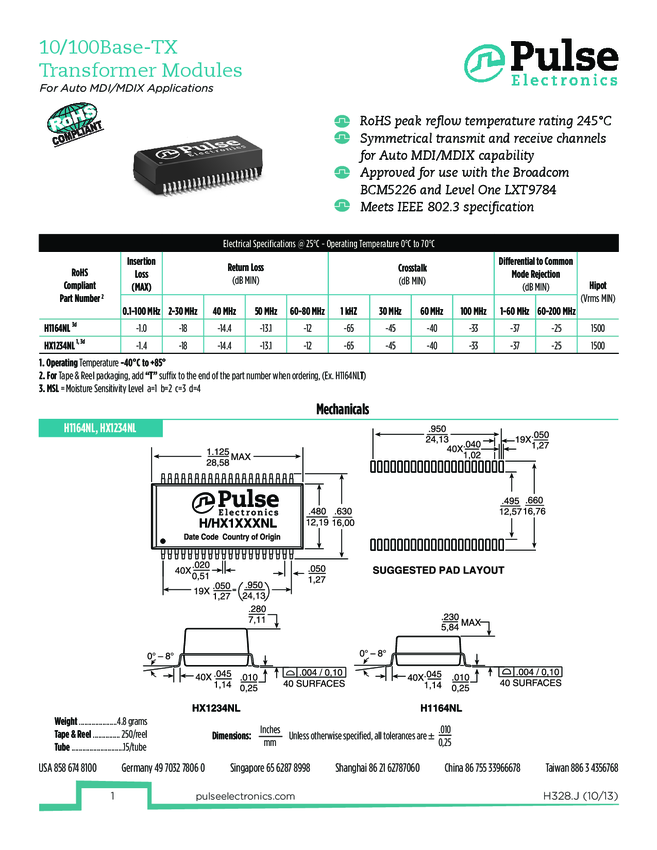 Telecom Transformer 1500Vrms -1dB Surface Mount
