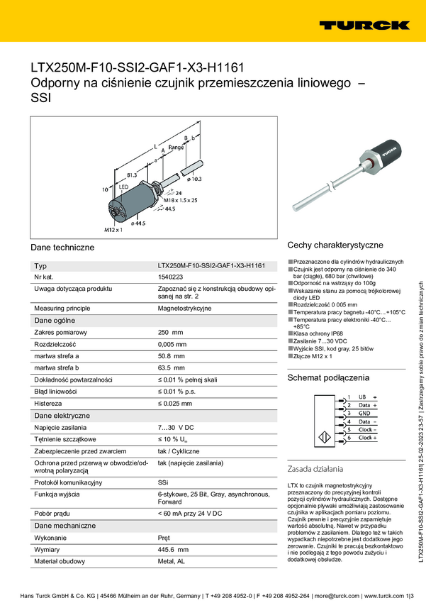 Turck Czujnik położenia liniowego LTX250M-F10-SSI2-GAF1-X3-H1161