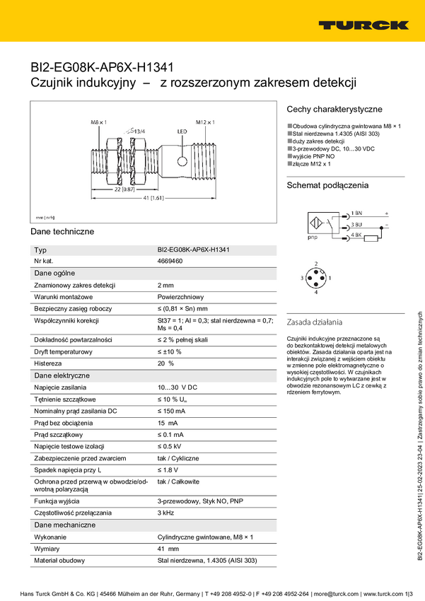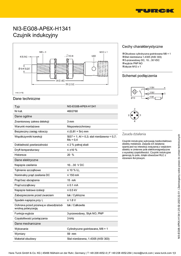 Turck Czujnik indukcyjny nie podtynkowy PNP, Zamykający NI3-EG08K-AP6X-H1341