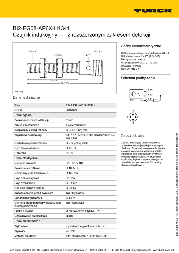 Czujnik indukcyjny Turck BI2-EG08-AP6X-H1341, 10 - 30 V, 1 szt.