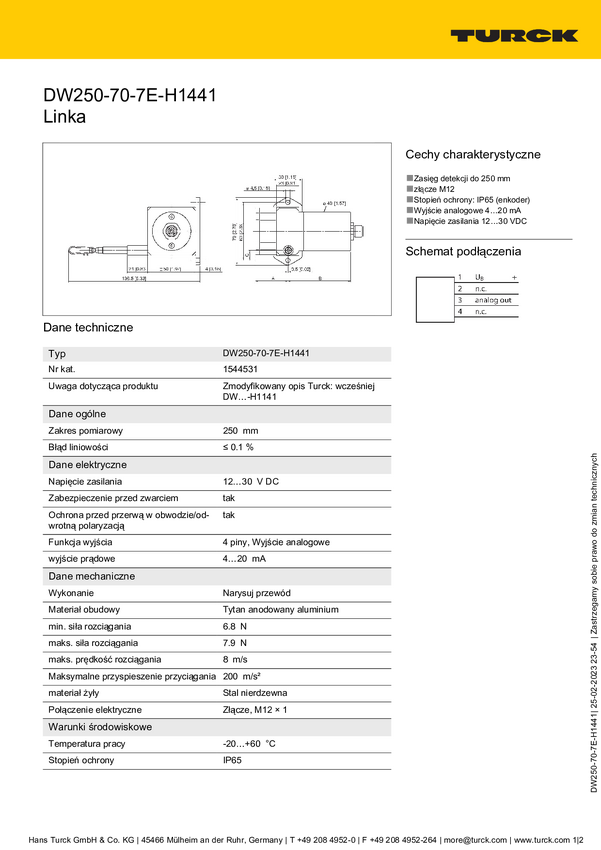 Turck Czujnik przemieszczenia DW250-70-PA-H1441