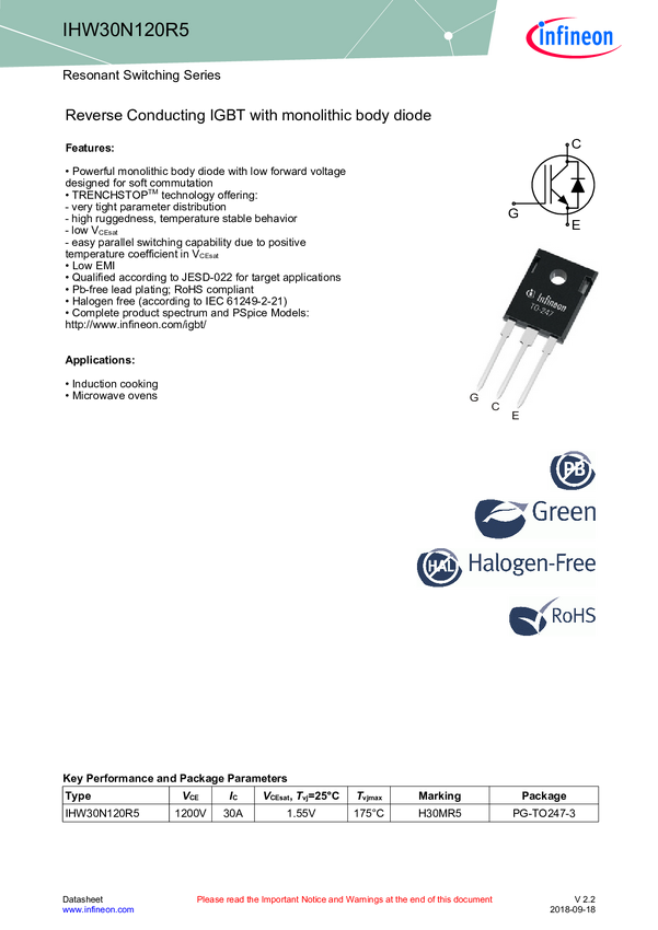 Tranzystor; IHW30N120R5XKSA1; IGBT; 30A; 1200V; 165W; TO247; THT; H30N120 / H30MR5; INFINEON; RoHS